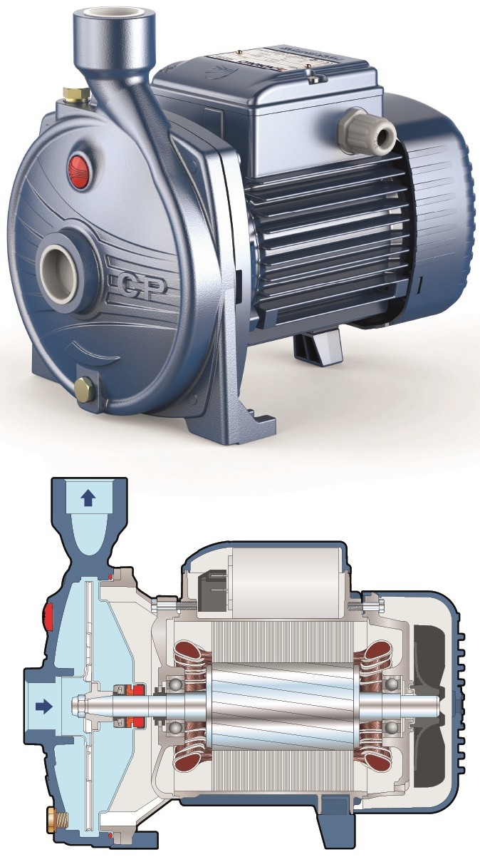 Серия СР включает в себя электронасосы центробежного типа с одним рабочим колесом, которые объединяет четкий дизайн и совершенно определенные конструктивные решения, обусловливающие их эксплуатационные характеристики. Рабочее колесо, качающееся на ведущем валу, находится прямо напротив всасывающего патрубка, размещенного на корпусе насоса. Структура рабочего колеса насоса Pedrollo обеспечивает при минимальных гидравлических потерях, радиальное движение жидкости по направлению от центра к периферии, в процессе которого радиальные лопасти, имеющиеся внутри канала рабочего колеса, передают энергию накачиваемой жидкости как в виде давления, так и в виде увеличения скорости потока. На выходе из рабочего колеса жидкость устремляется в спираль, которая, совместно с коническим диффузором, обеспечивает преобразование части кинетической энергий в энергию напора.